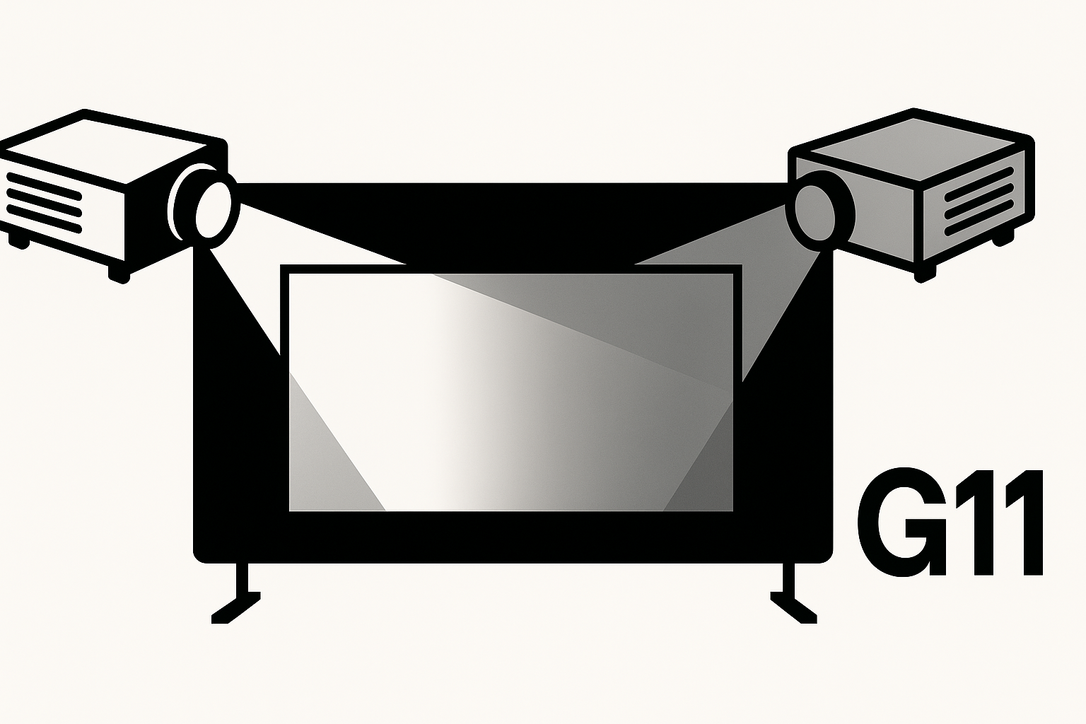 - Configuration: two projectors and a planar screen; projector optical axes nominally normal (perpendicular) to the screen.
