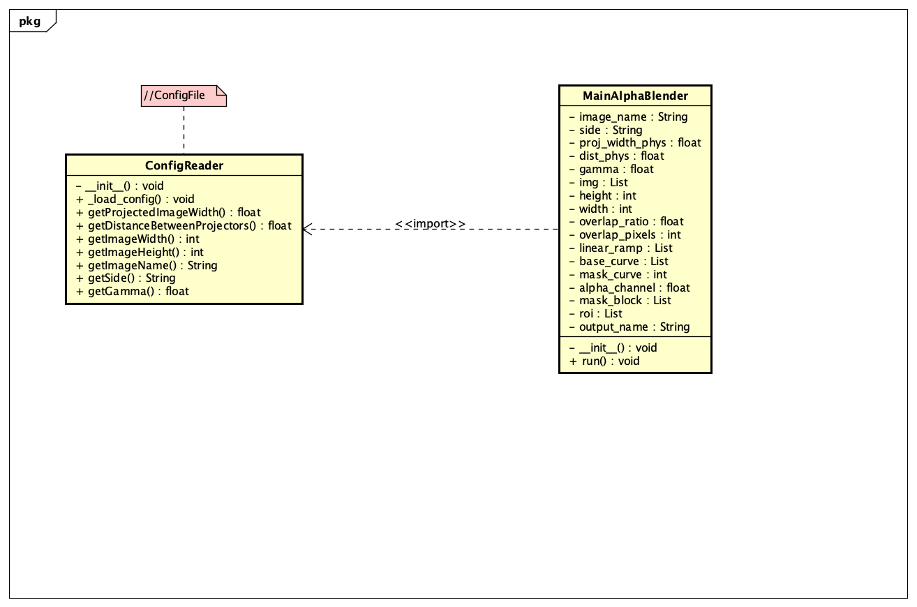 Description : This is the first version of the class diagram, showing the MainAlphaBlender class imports the ConfigReader class. The diagram also shows the attributes and the functions in each class